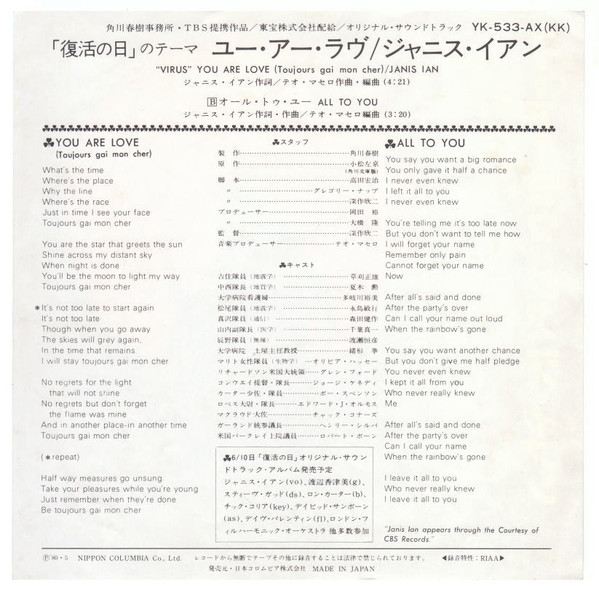ジャニス・イアン – ユー・アー・ラブ (復活の日のテーマ Virus) (7″, Single)