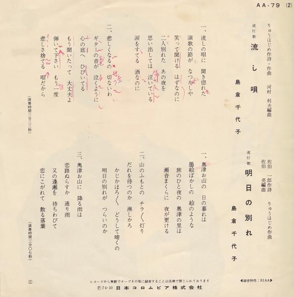 島倉千代子 – 流し唄 (7″, Single)