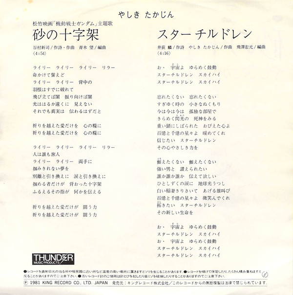 やしきたかじん – 砂の十字架~松竹映画「機動戦士ガンダム」主題歌 (7″)