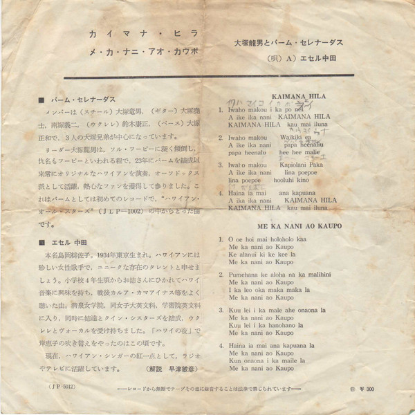 エセル中田, 大塚龍男とパーム・セレナーダス* – カイマナ・ヒラ (7″)