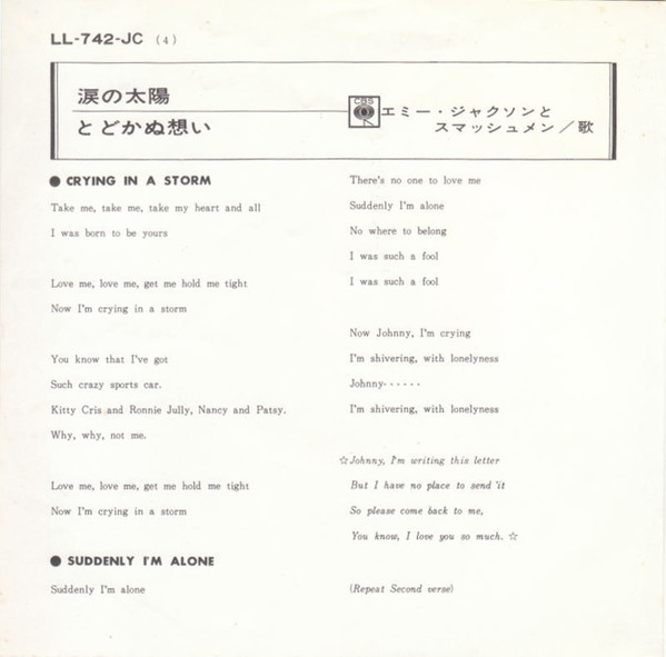 エミー・ジャクソン と スマッシュメン = Emy Jackson And The Smashmen – 涙の太陽 = Crying In A Storm / とどかぬ想い = Suddenly I’m Alone (7″, Single)