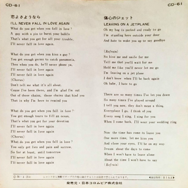 A. 恋よさようなら = I’ll Never Fall In Love Again 1:43