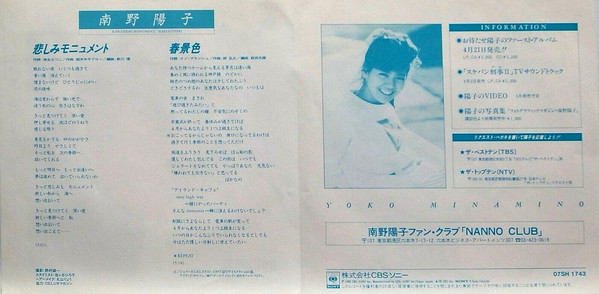 南野陽子 – 悲しみモニュメント (7″, Single)