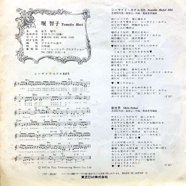 堀 智子 – シーサイド・ホテル805 = Seaside Hotel 805 (7″, Single)