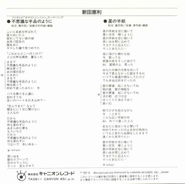 Vinyl (VG) Picture cover (VG) / 新田恵利 – 不思議な手品のように /