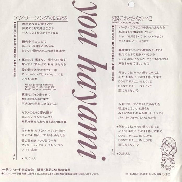 早見優 – アンサーソングは哀愁 / 恋に落ちないで (7″, Single, Promo)
