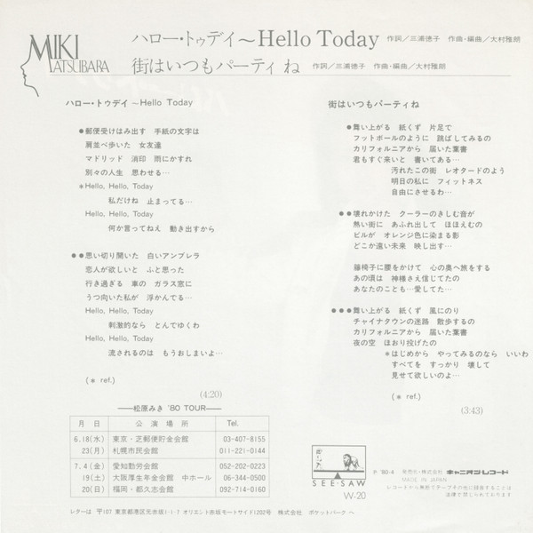 松原みき – ハロー・トゥデイ = Hello Today (7″, Single)