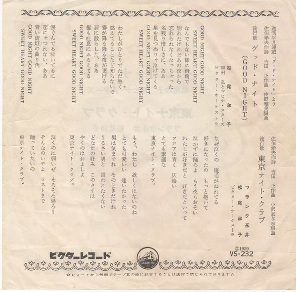 松尾和子, マヒナ・スターズ*, フランク永井 – グッド・ナイト/東京ナイト・クラブ (7″, Single)