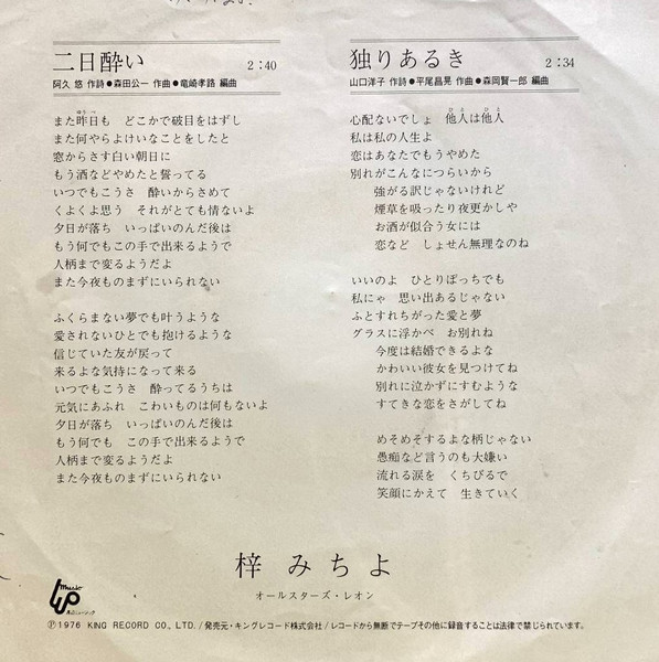Vinyl (VG) Picture cover (VG+) / 梓みちよ – 二日酔い /