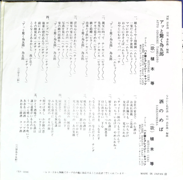 植木 等, ハナ肇とクレイジー・キャッツ – アッと驚く為五郎/酒のめば (7″, Single)