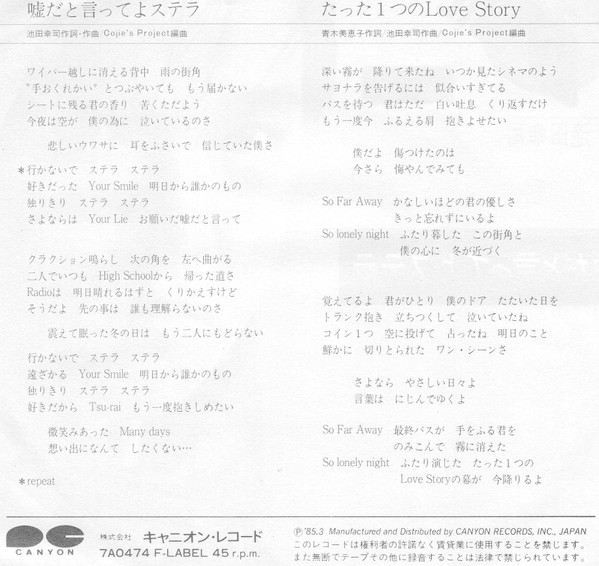 池田幸司 – 嘘だと言ってよステラ (7″, Single, Promo)