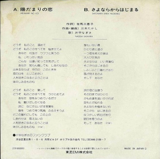 片平なぎさ – 陽だまりの恋 (7″, Single)