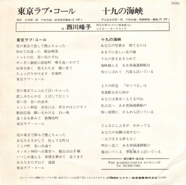 西川峰子 – 東京ラブ・コール (7″, Single)