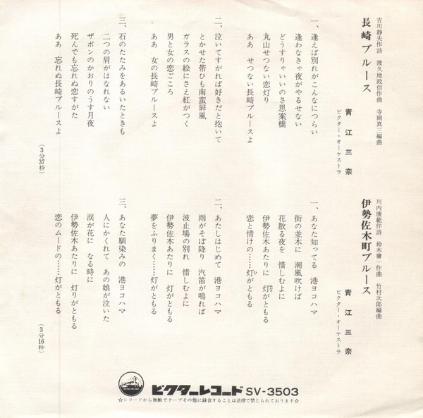 Vinyl (VG) Picture cover (VG+) / 青江三奈 – 長崎ブルース / 伊勢佐木町ブルース /