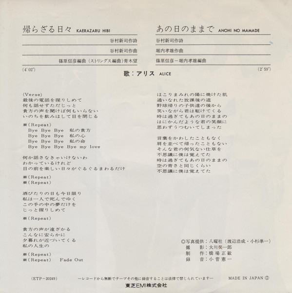 Alice = アリス – 帰らざる日々 (7″, Single)
