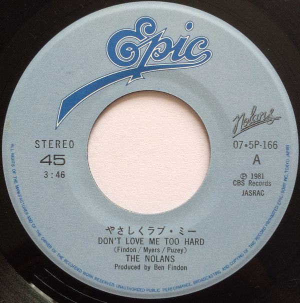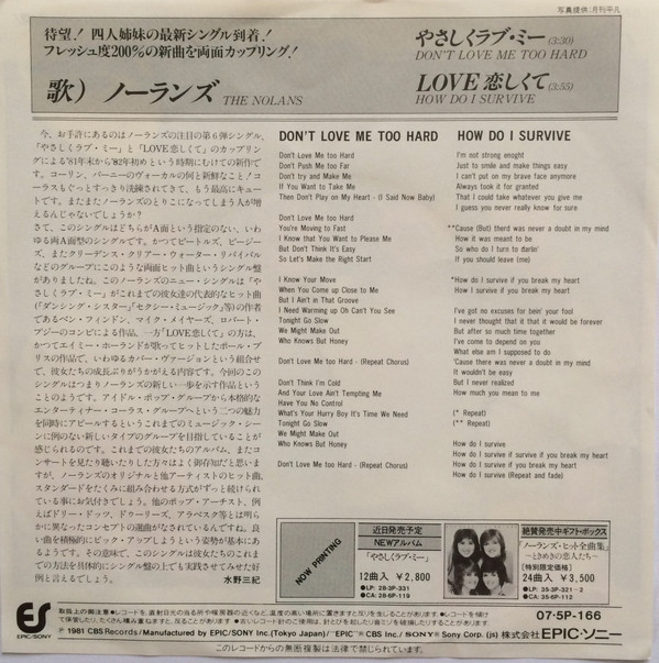 Nolans = ノーランズ – やさしくラブ・ミー = Don’t Love Me Too Hard / Love恋しくて = How Do I Survive (7″, Single)