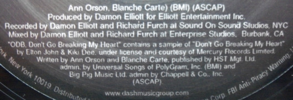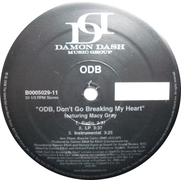 “ODB, Don’t Go Breaking My Heart” contains a sample of “Don’t Go Breaking My Heart” by Elton John & Kiki Dee, under license and courtesy of Mercury Records Limited.