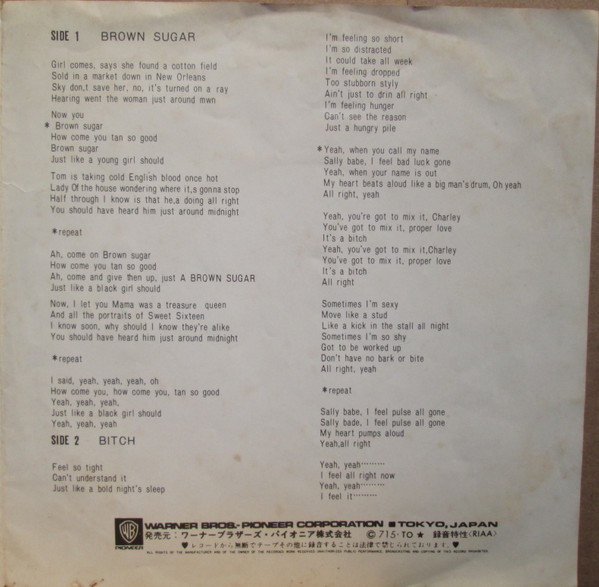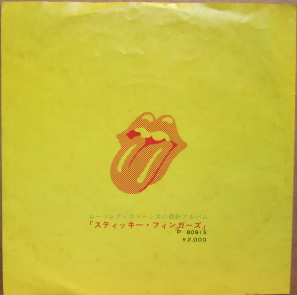 1971 Japanese 7″ single, 2nd sleeve, also including Bitch, complete with an alternate red bordered wraparound gatefold picture insert, featuring an image of the group relaxing in a hammock [and a nice wicker chair for Mick] with Japanese text biography and lyrics printed inside