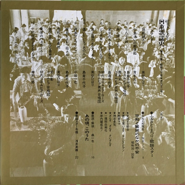 The book has an article listing the principal matsuri (traditional festivals) for each region of Japan, along with the kayō stars from these regions; a long historical article, lyrics to the songs and liner notes, and biographies of the principal musical artists from that period.