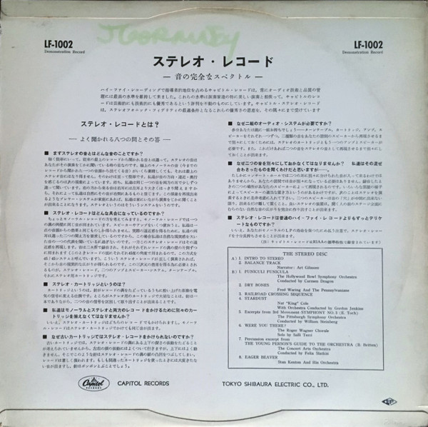 Japanese release of unknown year. Red Capitol label. Catalog number is LF 1002/LF-1002 on front and back covers and labels, SWAL-9032 on labels and runout. Thin paper inner sleeve opens with a flap at the top and includes an ad for stereo equipment.